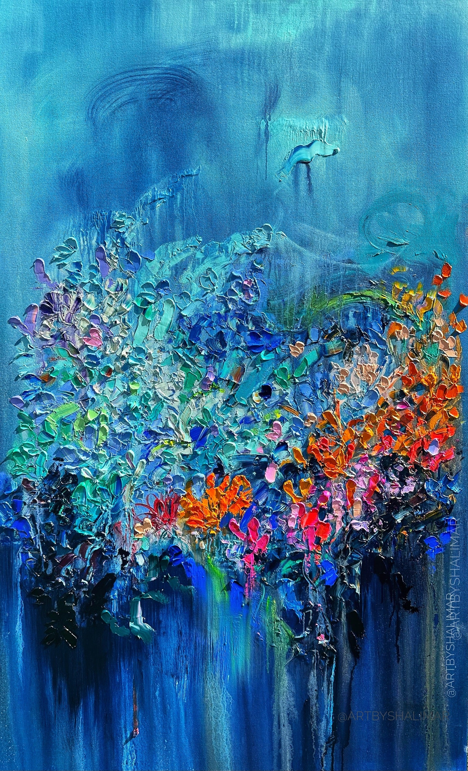 Base layers are acrylic covered with oil paint throughout. I use a palette knife for painting the majority of all of my pieces. Canvas is stretched cotton over wood. Edges are painted to compliment the art.If interested in a frame, we do custom made to order frames that will need to be purchased separately. We can have your piece framed, wired and shipped to you. Framing strongly encouraged to preserve and protect the artwork.