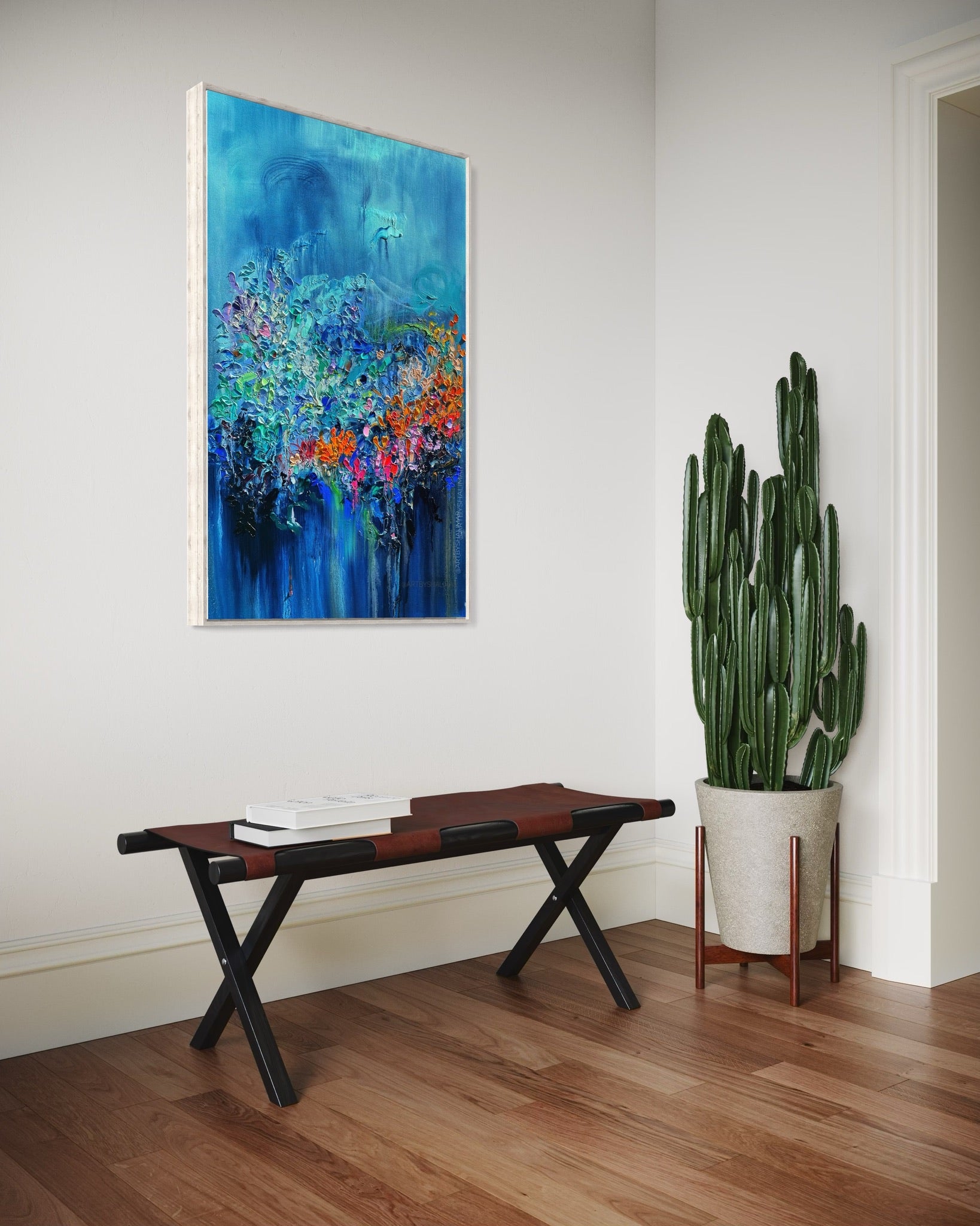 We are happy to provide more extensive photos, videos, and renderings of the painting for you if you have a questions or concerns about how it will look in your space.