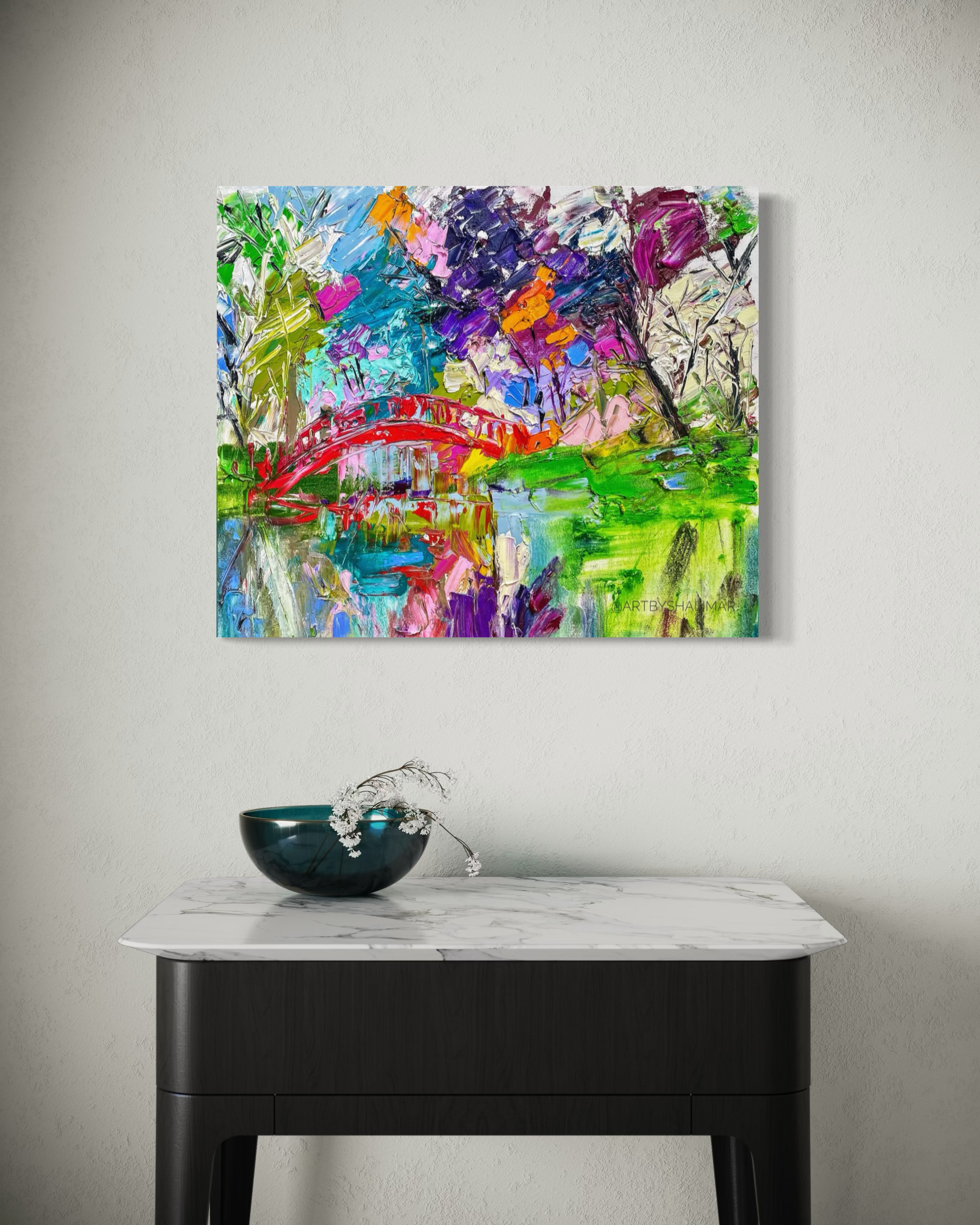 We are happy to provide more extensive photos, videos, and renderings of the painting for you if you have a questions or concerns about how it will look in your space.