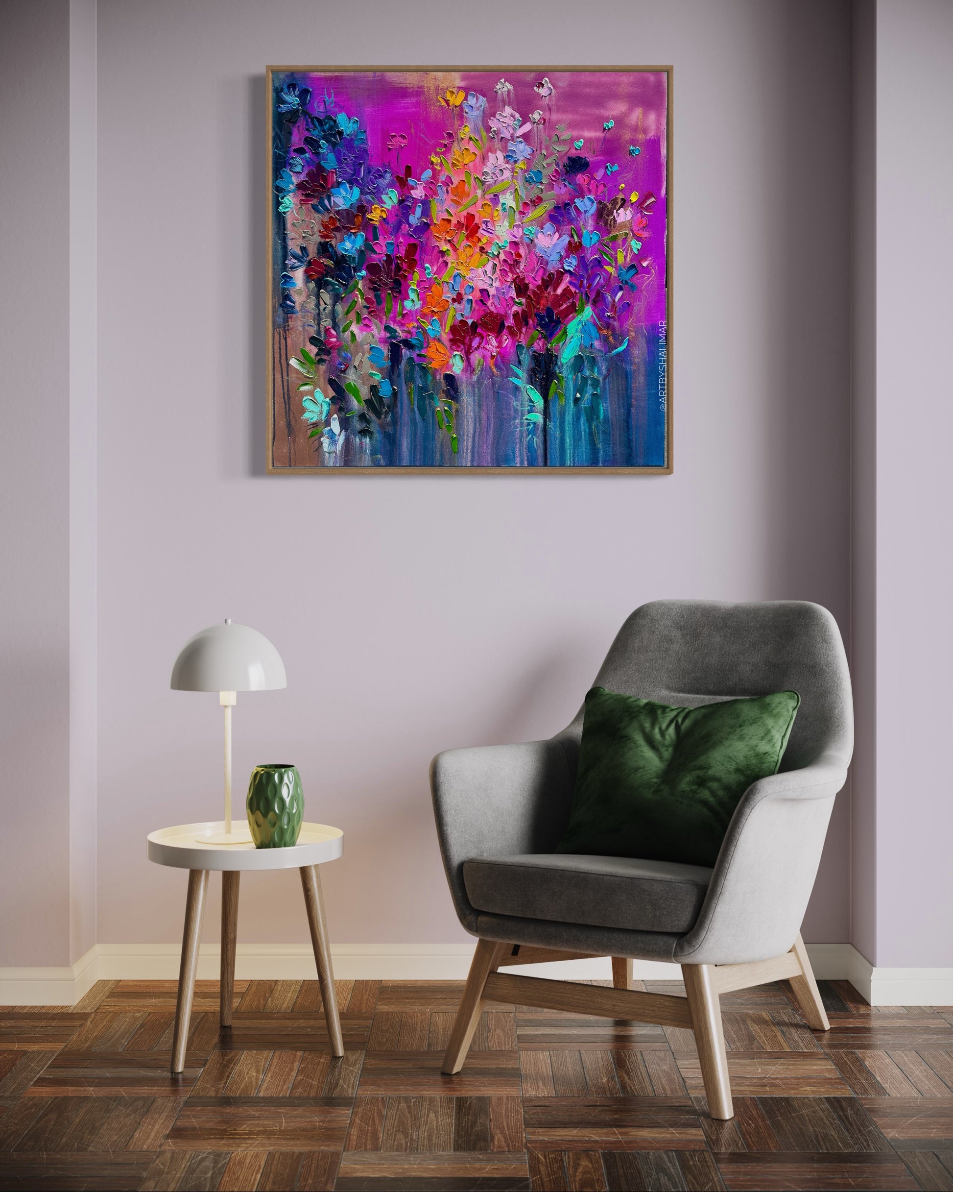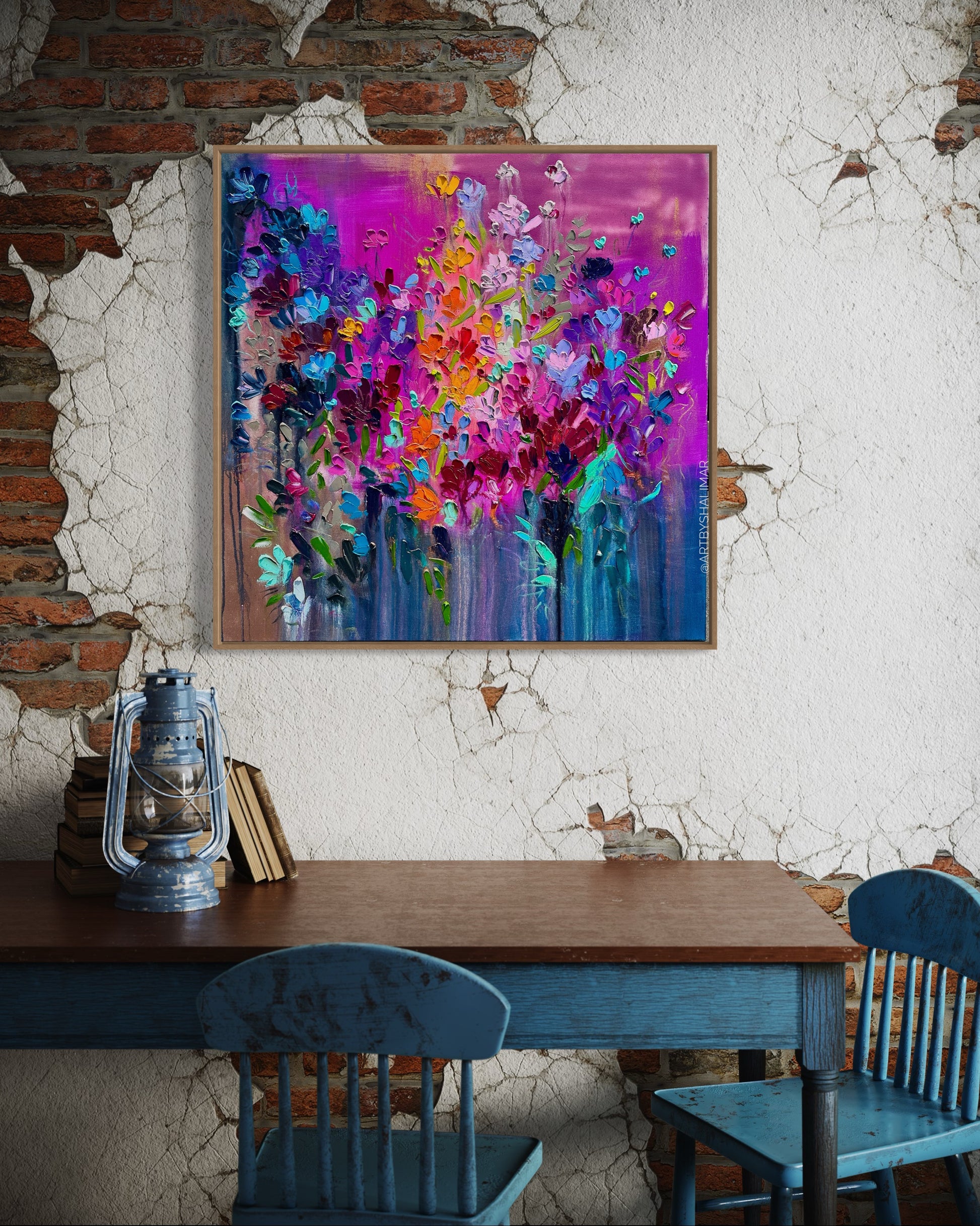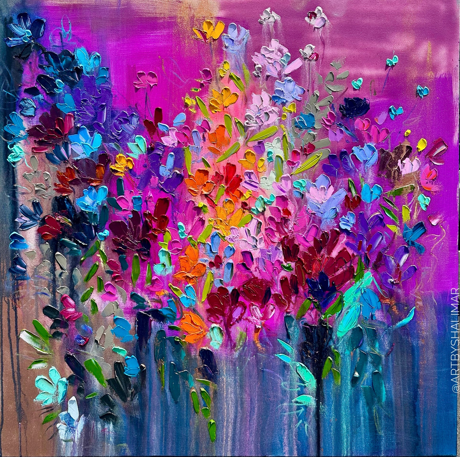 This painting is inspired by an idea of floral fireworks meant to bring energy and inspiration to your space.