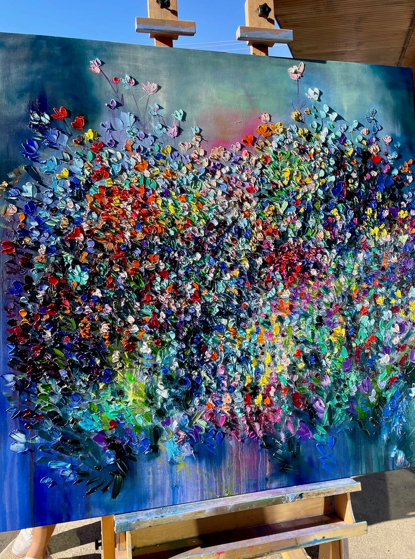 Who wouldn’t want to believe in tiny magical creatures that leave coins under your pillow or sprinkle pixie dust so you can soar off to Neverland and never grow up? This piece builds on one I created over the summer that was called Magical Escape. It goes deeper in their world that is within a patch of glowing wildflowers where fairies are very active. Look closely, and you’ll notice powdered oil paint scattered like pixie dust. Aside from all of the whimsical meaning behind this piece, a deeper meaning is that you should never give up hope for what you believe!