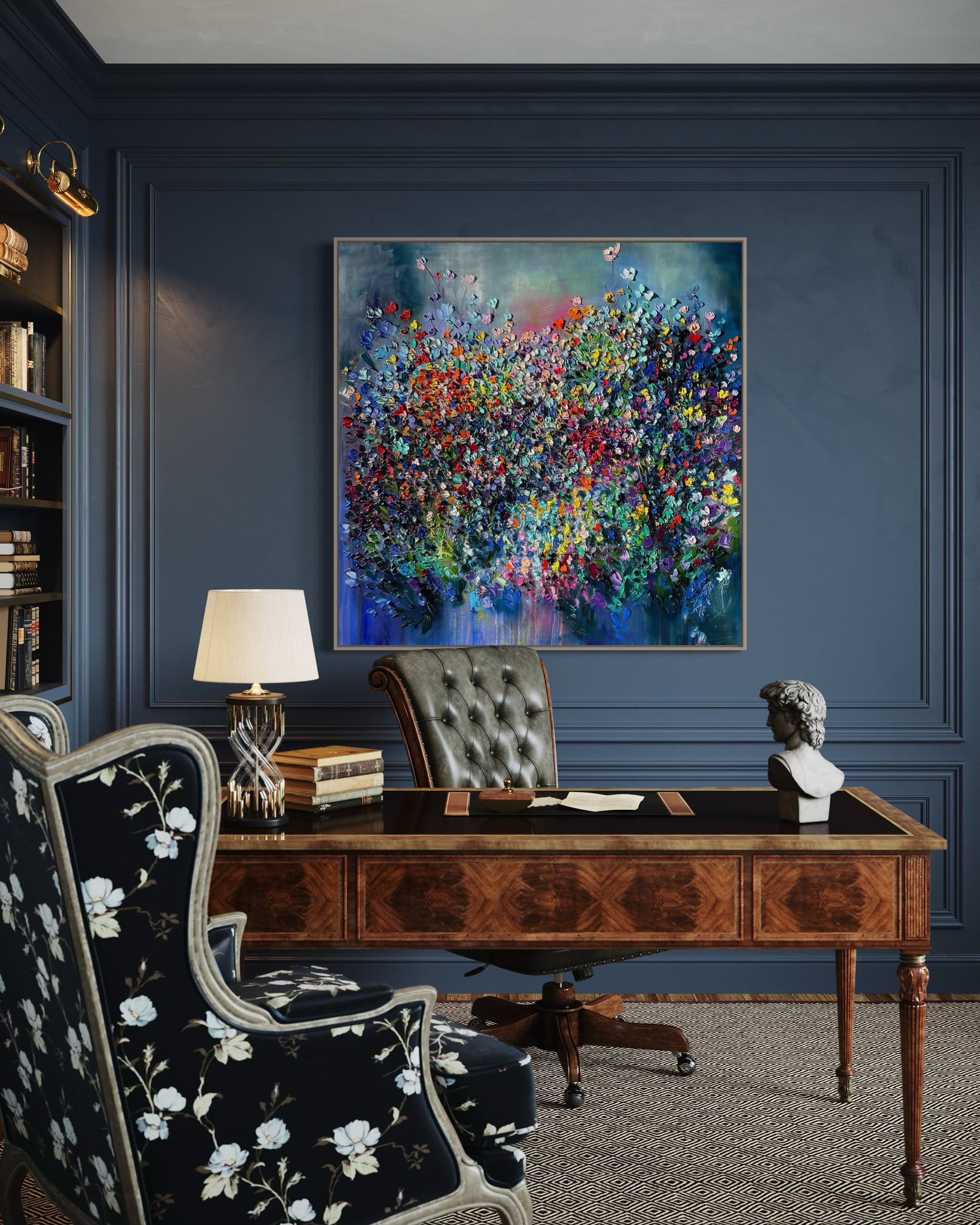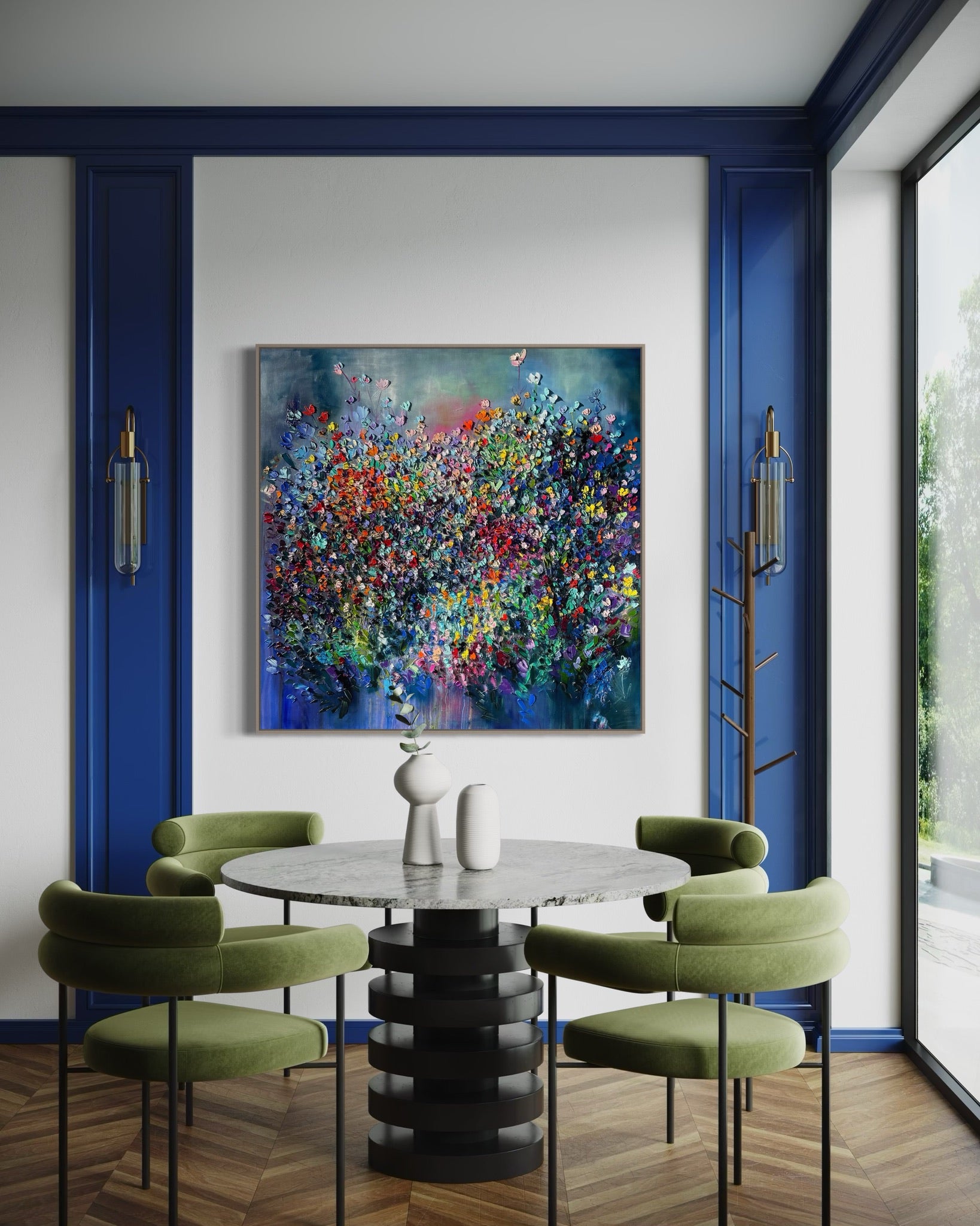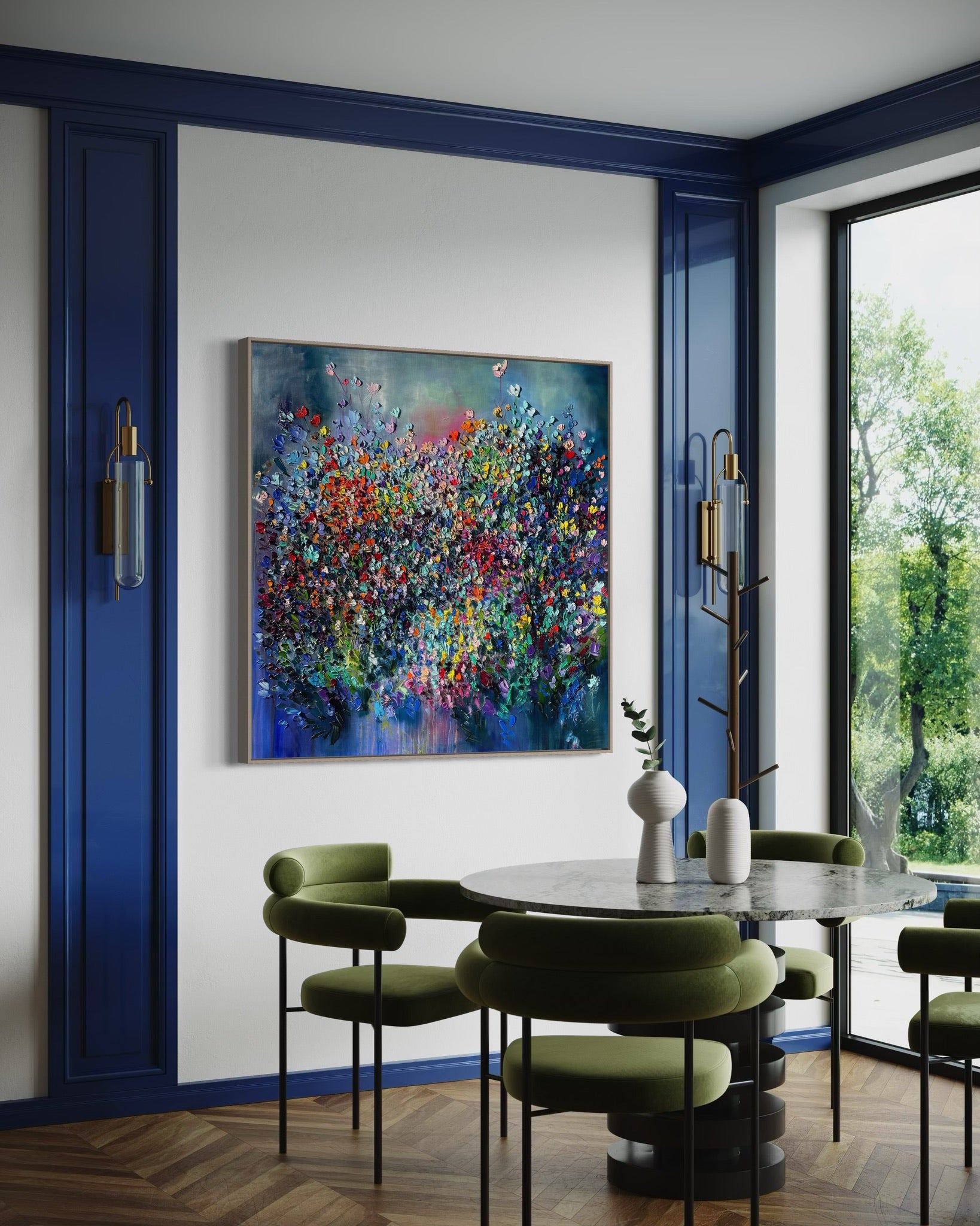 We are happy to provide more extensive photos, videos, and renderings of the painting for you if you have a questions or concerns about how it will look in your space.