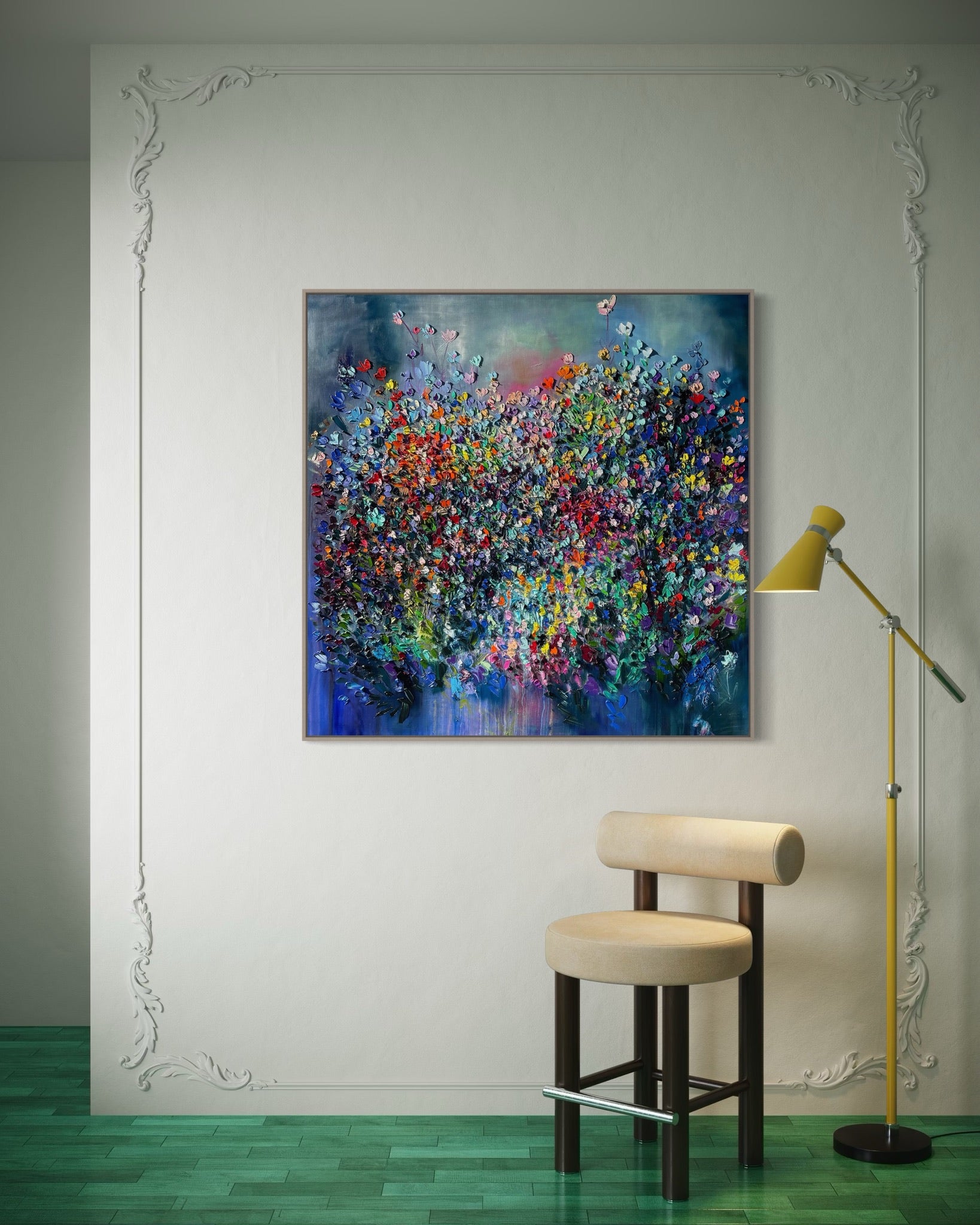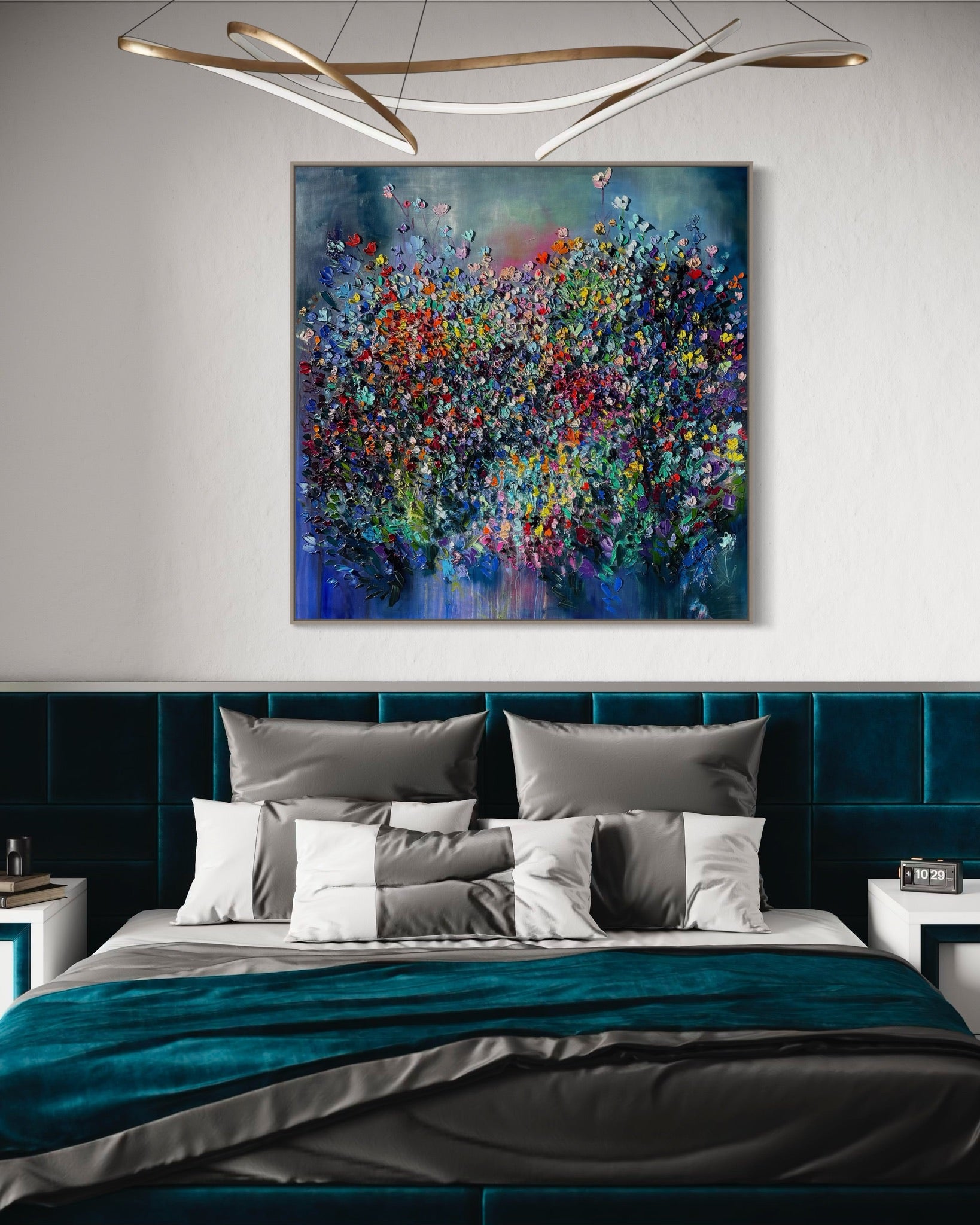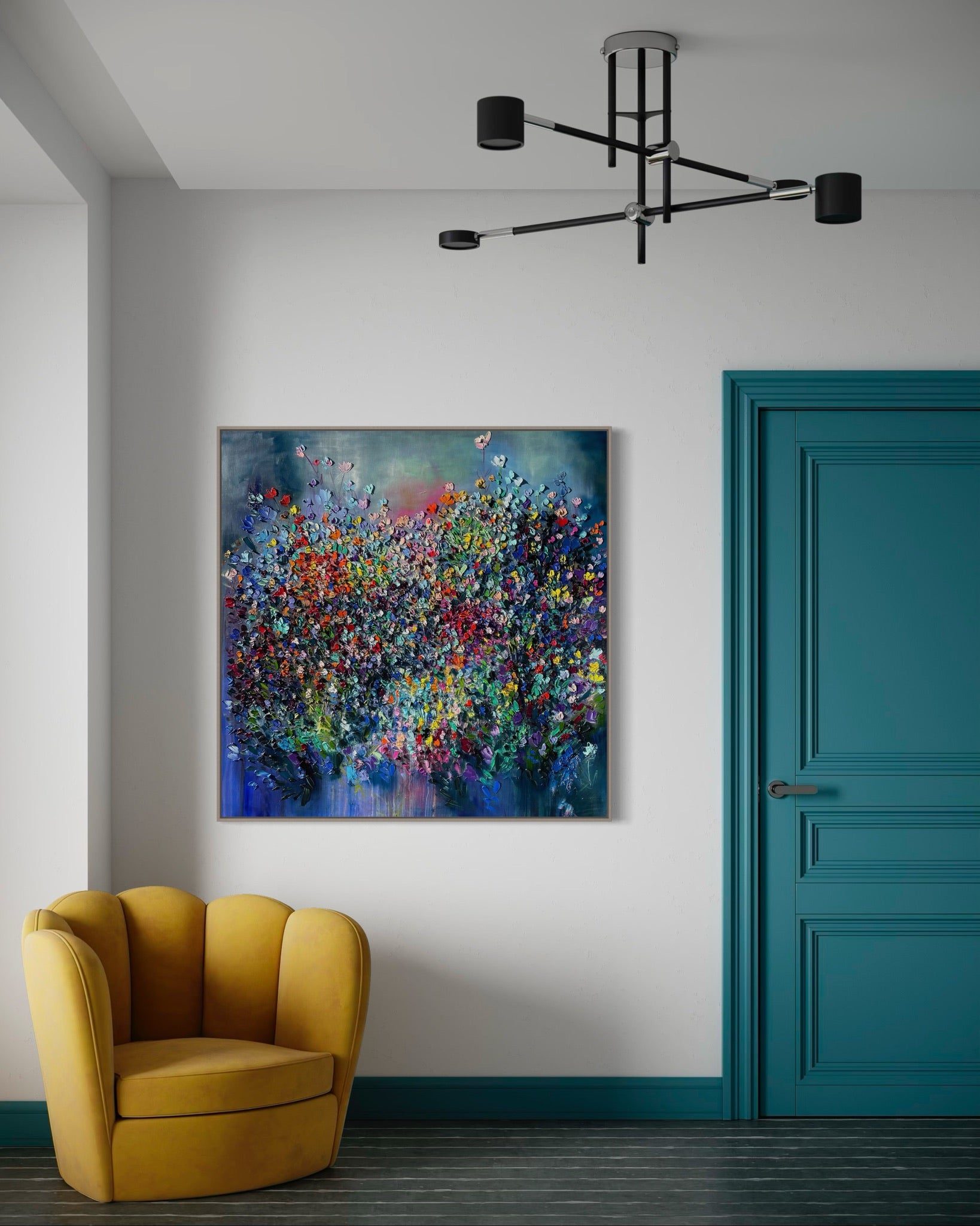 We are happy to provide more extensive photos, videos, and renderings of the painting for you if you have a questions or concerns about how it will look in your space.