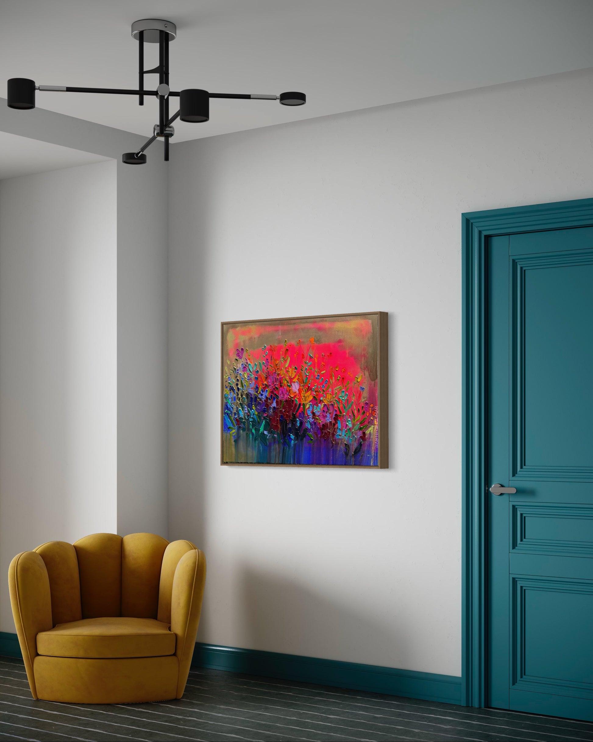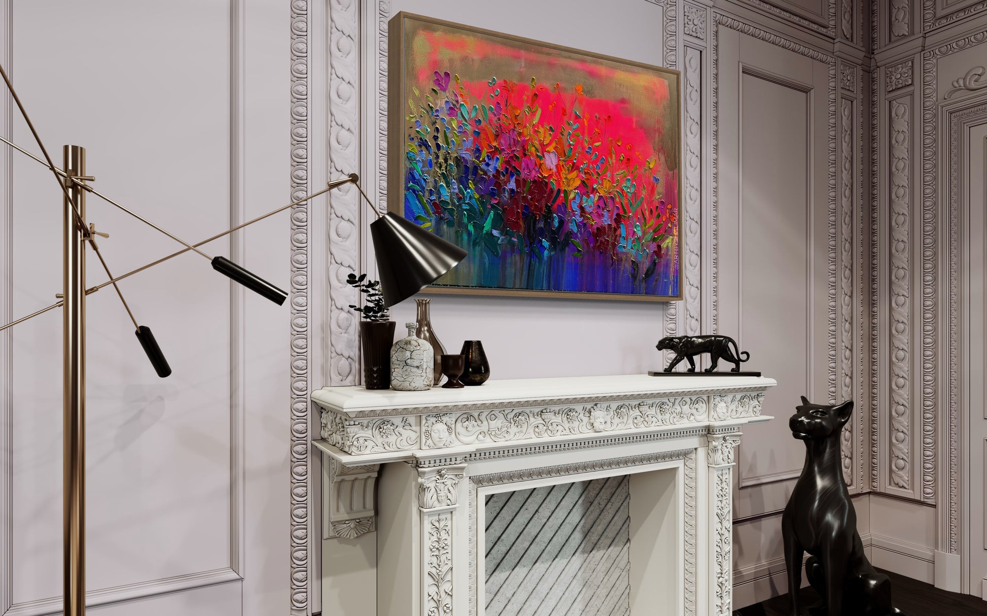 We are happy to provide more extensive photos, videos, and renderings of the painting for you if you have a questions or concerns about how it will look in your space.