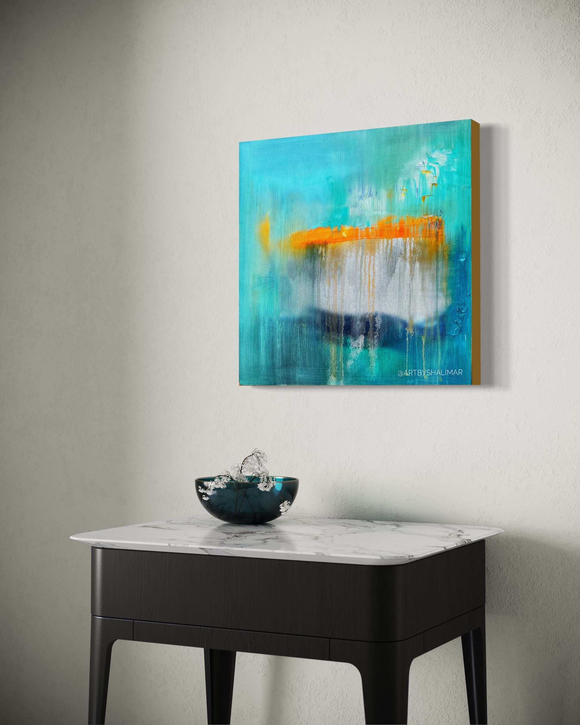 We are happy to provide more extensive photos, videos, and renderings of the painting for you if you have a questions or concerns about how it will look in your space.