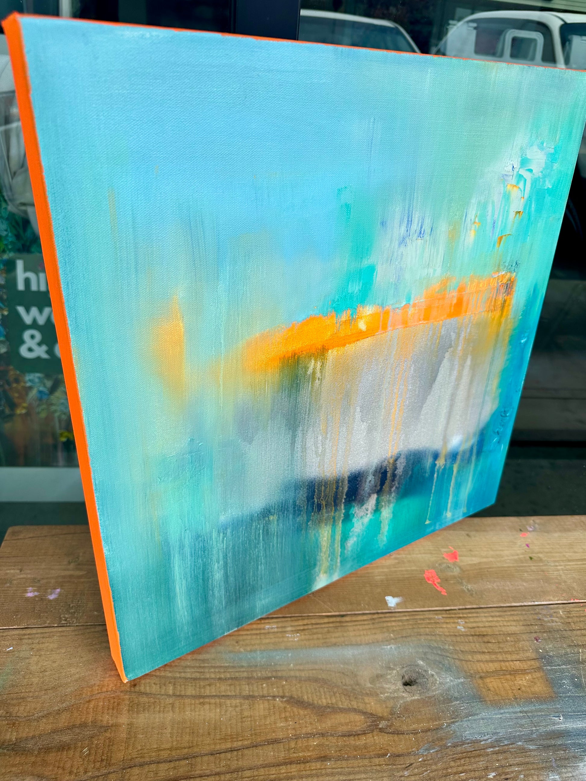 Base layers are acrylic covered with oil paint throughout. I use a palette knife for painting the majority of all of my pieces. Canvas is stretched cotton over wood. Edges are painted to compliment the art.