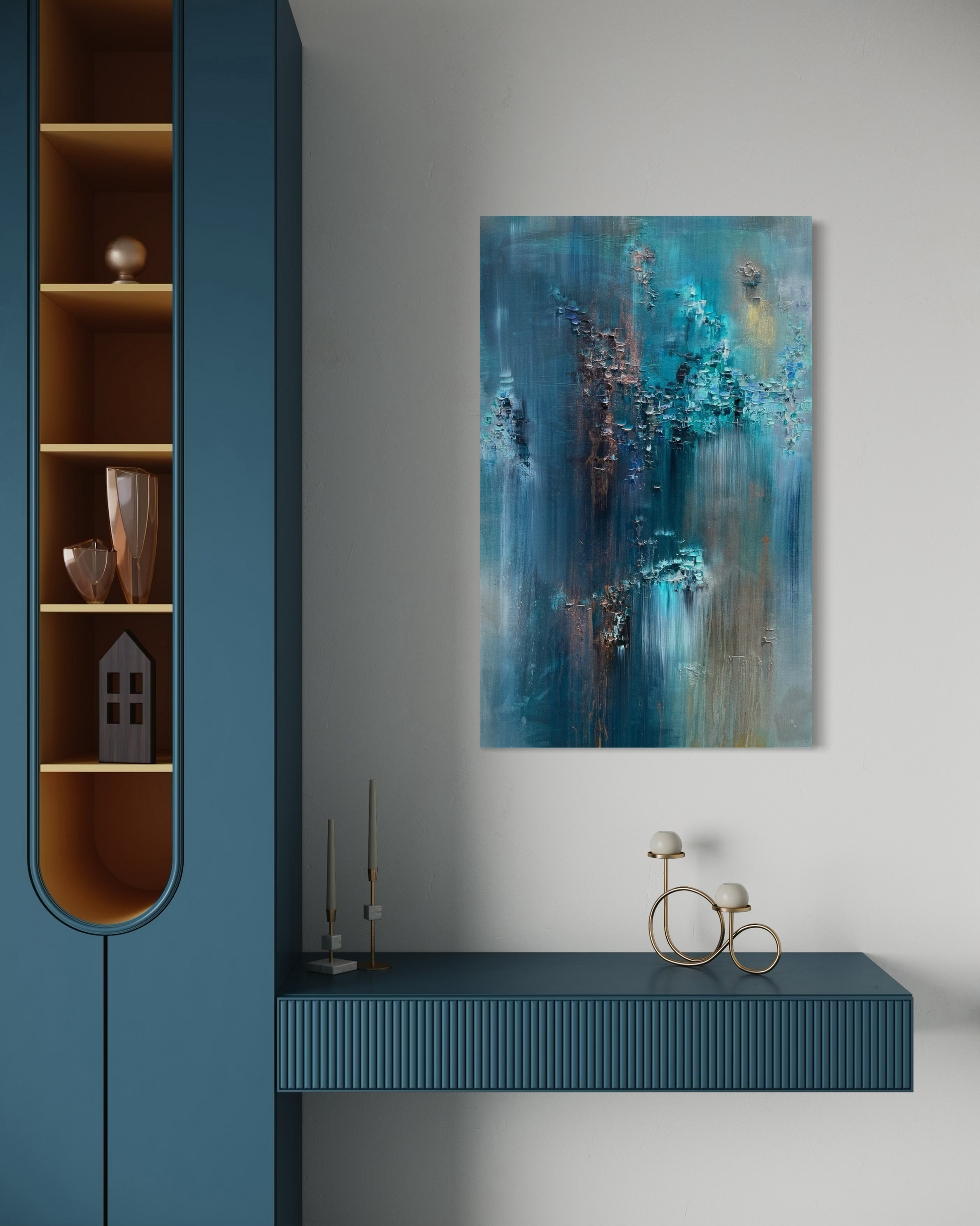 "Ocean Breaths" (2025) handmade painted wooden frame that is painted a rusty gold