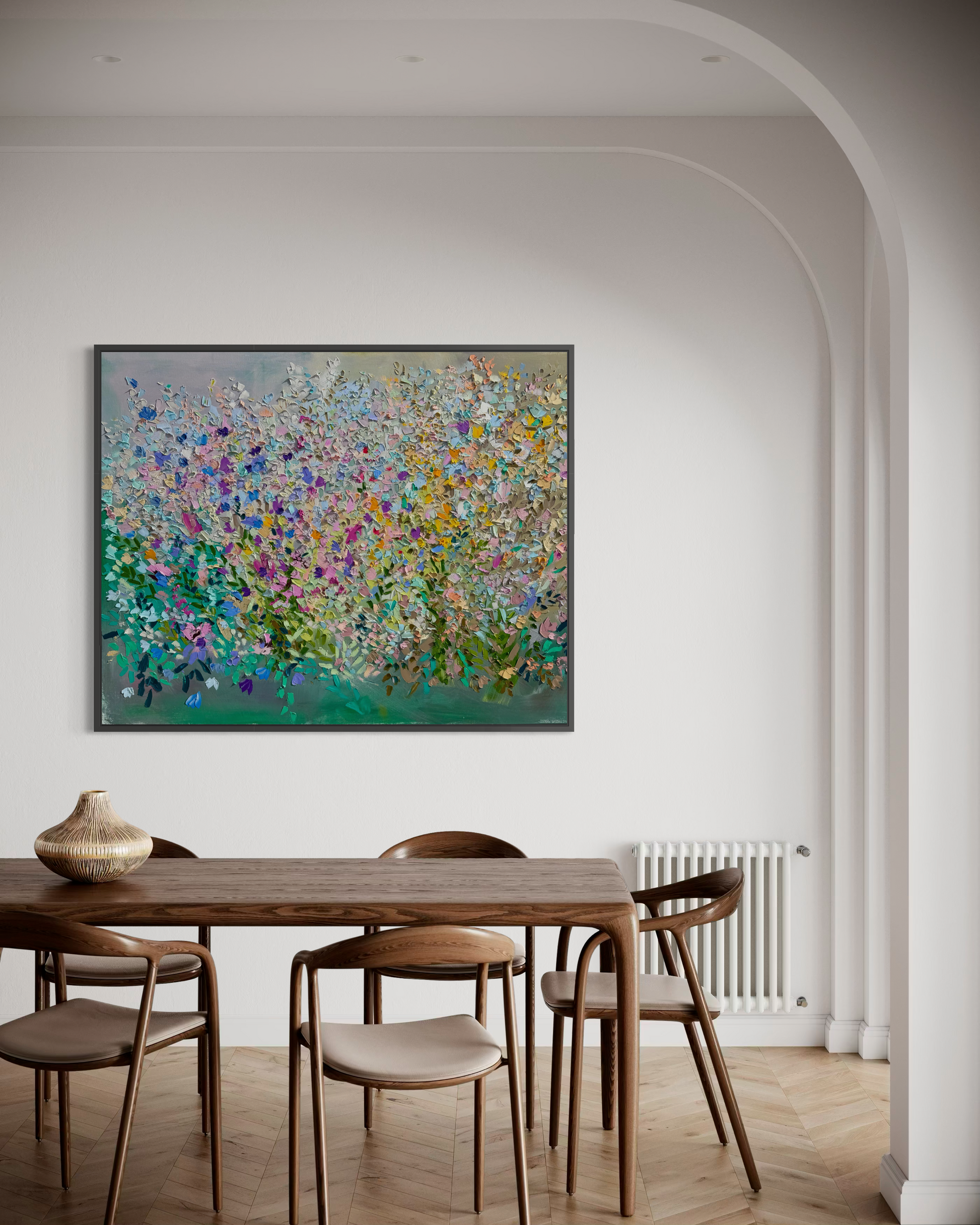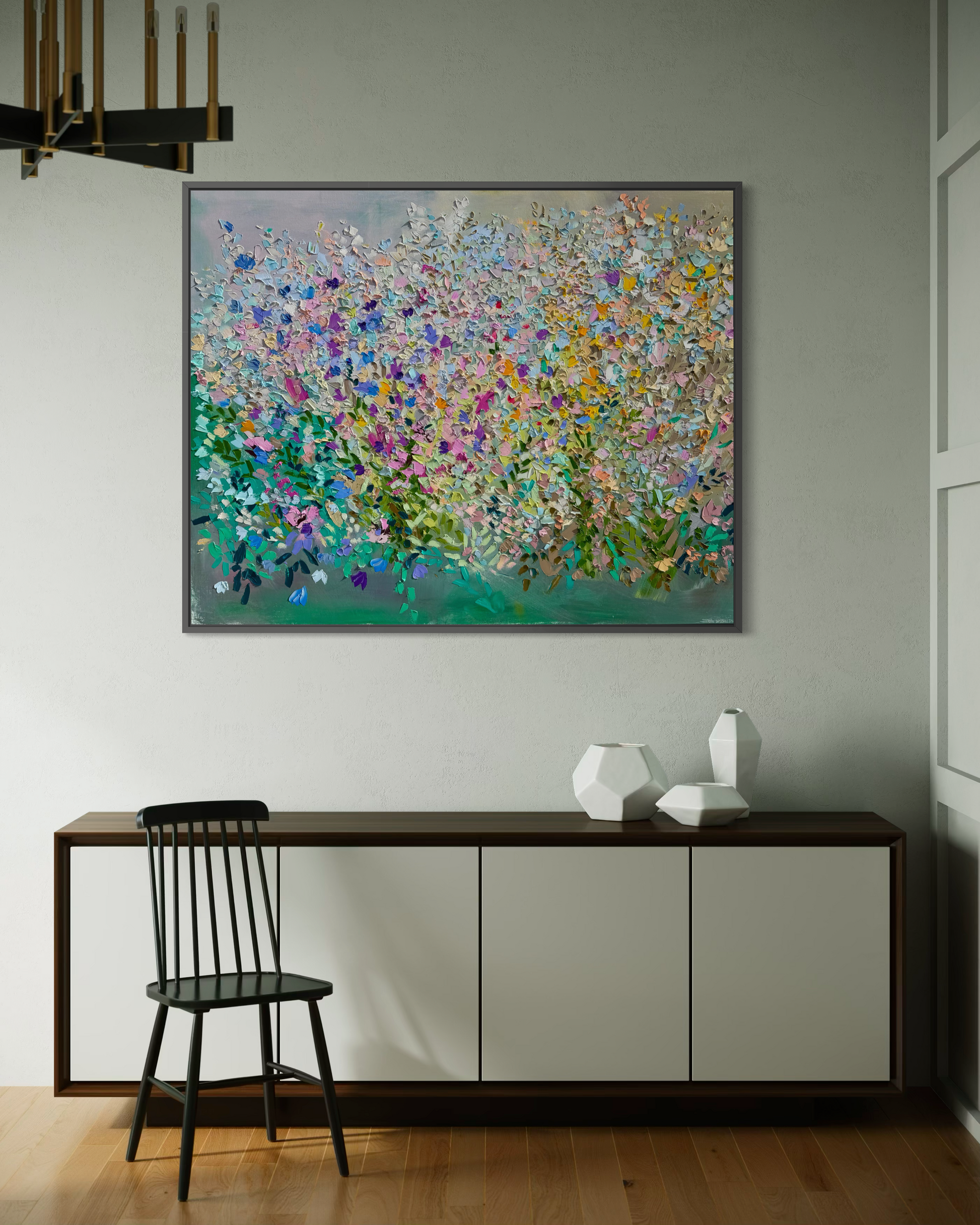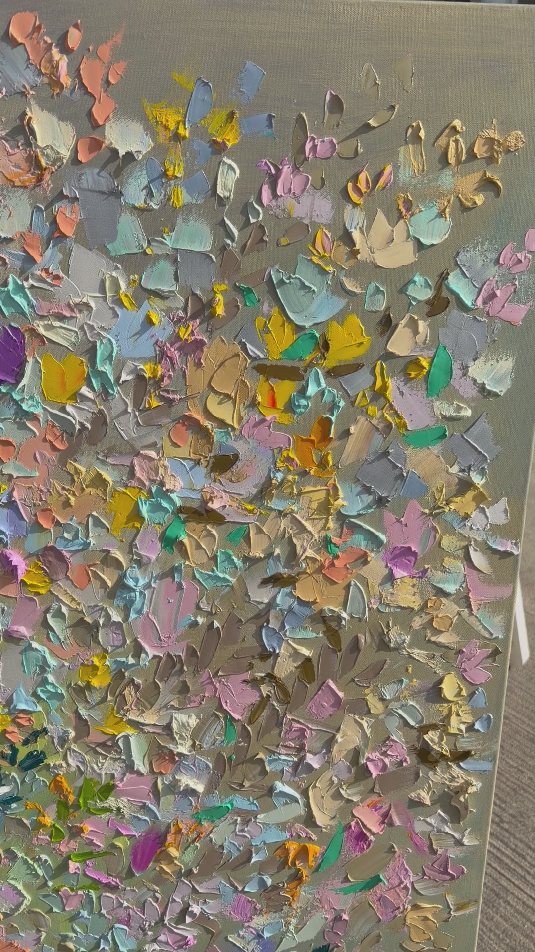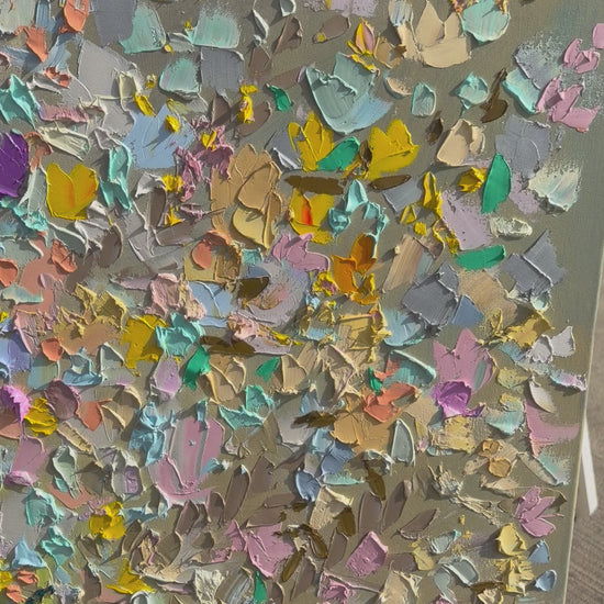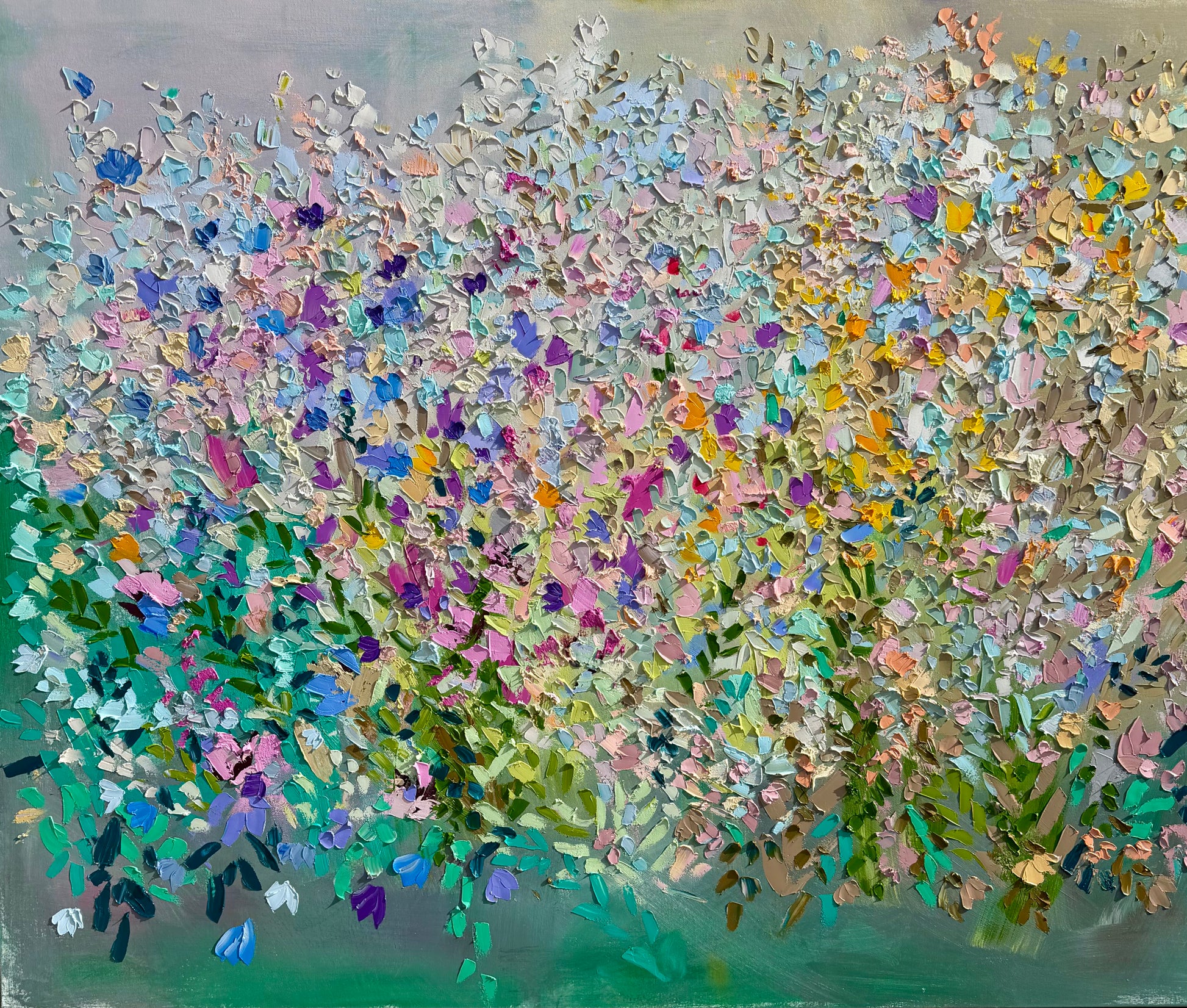 Built up with palette knife and heavy impasto, this large-scale painting captures a garden at its absolute peak. Magenta, violet, gold, coral, and sky blue press and layer across the canvas, rooted in deep emerald greens that give way to a soft, airy bloom of pastels above. Wild and harmonious at the same time — a painting you feel before you fully see it.